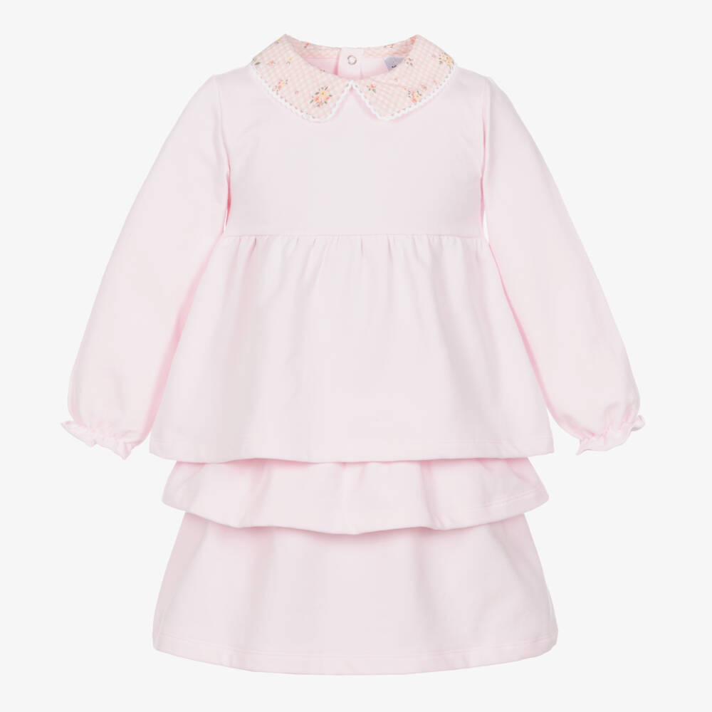 A lovely pink top and skirt set for girls by Spanish brand Babidu. Super comfortable, it is made in soft cotton jersey with a cosy fleecy inside. The top has frilly elasticated cuffs, a feminine flared hem, and a pretty floral gingham collar edged in white ricrac trim. The tiered layered skirt has an elasticated waist for easy pull on and an ideal fit.