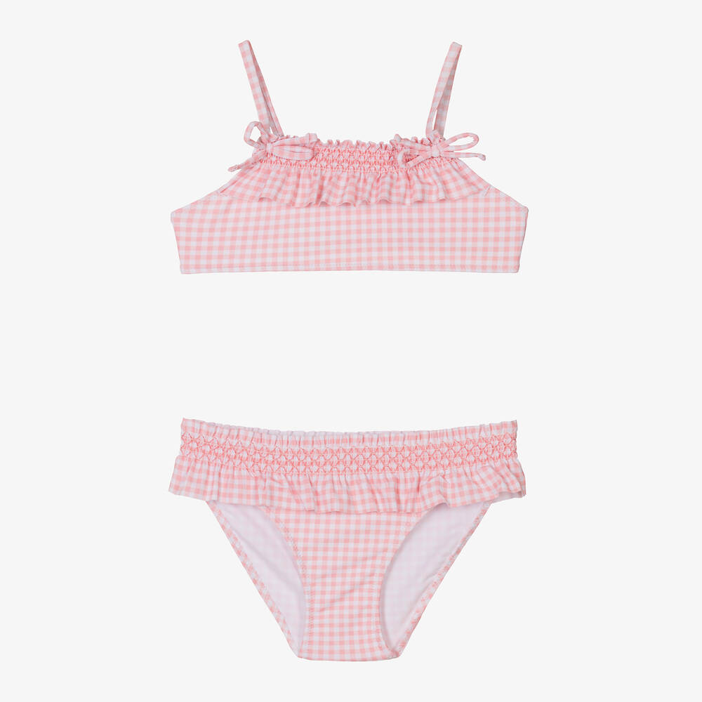 Sweet pink and white gingham bikini for girls by classic Spanish brand Babidu, with pretty embroidered shirring and frills. Silky and soft, the top has fixed bows on the front and fastens around the back with a clip. Both pieces are lined for comfort.