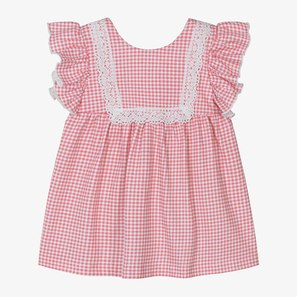 A pink checked dress for girls by Babidu, woven in lightweight cotton. For a sweet and classic look, it has a delicate lace trim on the chest and ruffled short sleeves. Button fastenings on the back add a neat finish.