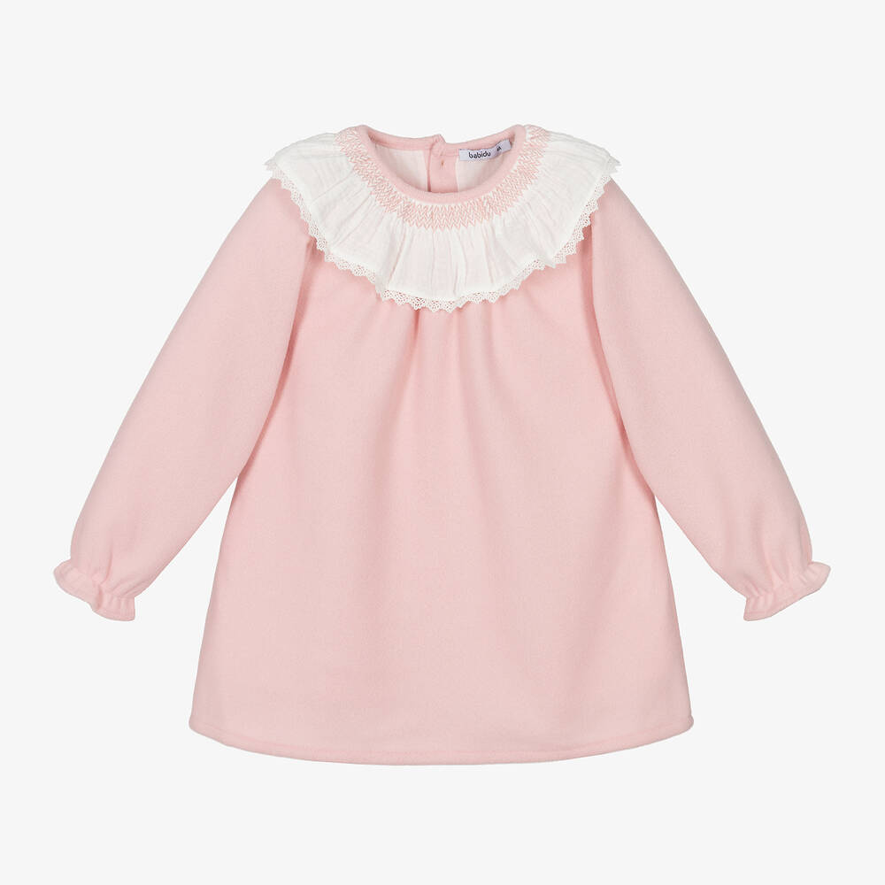 Pink dress for girls by Spanish brand Babidu, made in a soft brushed, mid-weight knit fabric. Fully lined, with a gentle A-line shape, it has an ivory ruffle collar with pink smocking and a delicate lace trim. This long-sleeved dress fastens with wooden buttons on the back.