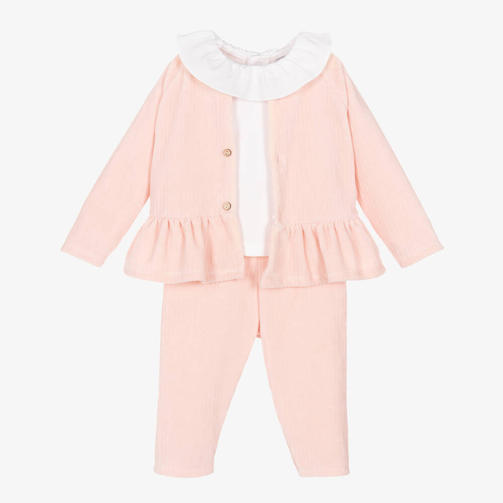 Pink velour trouser set for younger girls by Spanish brand Babidu, made in a soft cotton rich blend with a lovely ribbed pattern. The long-sleeved cardigan has a pretty peplum hem and button fastenings, while the trousers have a gently elasticated waistband with a decorative bow. Completing the set is a white, long-sleeved top with a pretty ruffle collar and popper fastenings on the back.