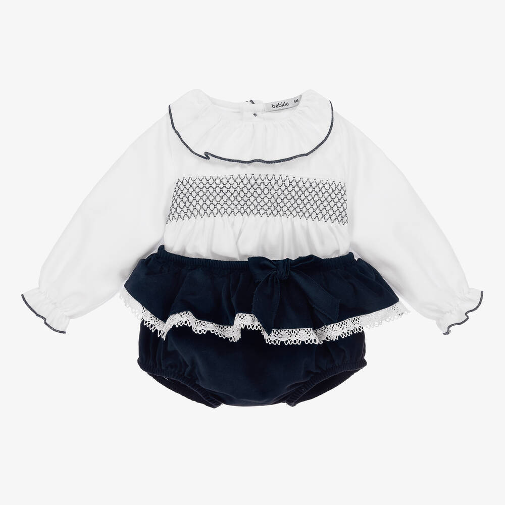 A traditionally styled shorts set for baby girls by Spanish brand Babidu. The white cotton twill blouse has red smocking detail across the chest, with a pretty ruffle collar and frilly cuffs on the long sleeves. There are wooden button fastenings on the back. The navy blue velvet shorts have a deep ruffle trim, edged in white lace and decorated with a beautiful bow on the front. They are gently elasticated around the waist and legs for comfortable wear.