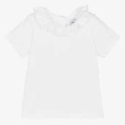 White cotton T-shirt for girls by traditional Spanish brand Babidu, made in soft, comfortable jersey. It has raglan sleeves, button fastenings on the front and is gathered below the bodice.