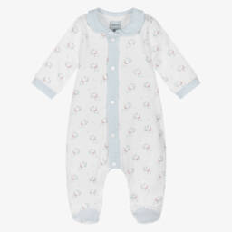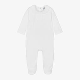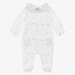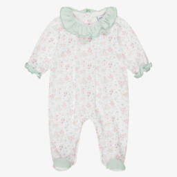White cotton babygrow for girls by Babidu, with a sweet floral print in red, blue and green. Made in soft and comfortable jersey, it has a scalloped voile collar and gently elsaticated ruffle cuffs. There are popper fastenings on the back and between the legs.