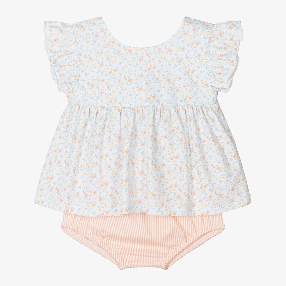 Pretty white and orange shorts set for little girls by Babidu. Made in soft jersey, the top has flutter sleeves and a striped bow on the back. It fastens with wooden-style buttons for a neutral touch, and is complemented by stretchy, orange pinstripe shorts.