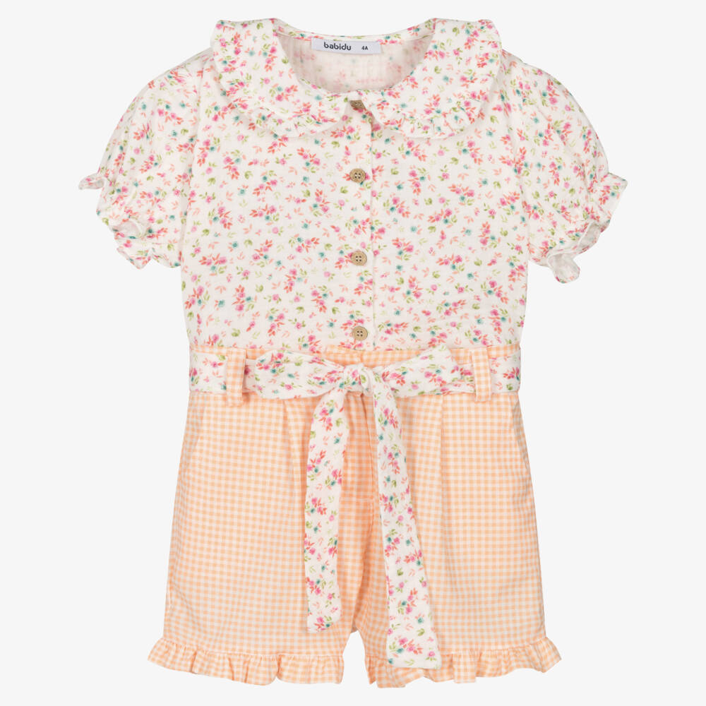 A lovely white, pink and orange shorts set for girls by Spanish brand Babidu, made in soft and lightweight cotton. The floral blouse has a ruffle trimmed collar, coconut button fastenings, and elasticated puff sleeves. To complement this style, the shorts feature a bright gingham pattern, with pretty frilly hems. They have a useful zip and button fastening, pockets and an elasticated back. This outfit comes with a removable floral belt.