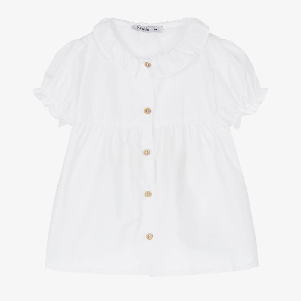 White cotton blouse for girls by traditional Spanish brand Babidu, made in comfortable, lightweight poplin. It has a ruffle collar, pretty puffed sleeves with gently elasticated, frilled cuffs and button fastenings on the front. It is gathered below the bodice.