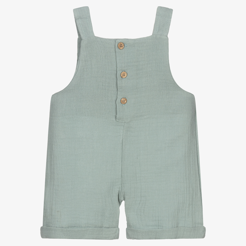 Short green dungarees for little boys and girls by Babidu. Made in lightweight cotton cheesecloth, they have beige button fastenings on the front and fixed turn-ups.