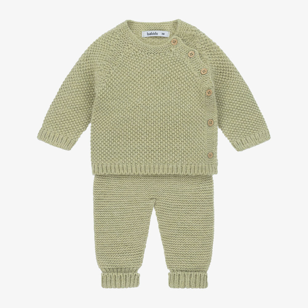 A warm-toned green trouser set for little boys and girls by Babidu, knitted in a cosy blend with wool and alpaca. A timeless look, the sweater has natural buttons to fasten on the front and the trousers have a stretchy ribbing on the waist and cuffs.
