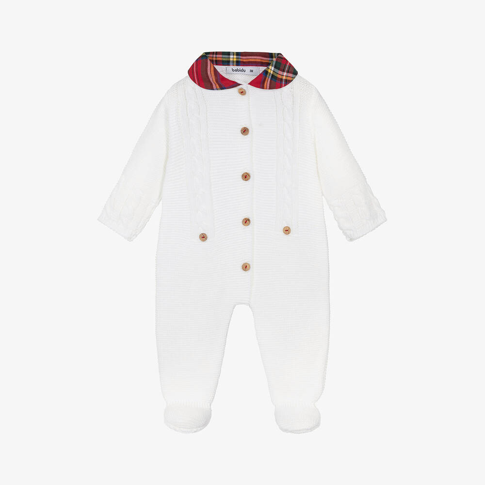 Ivory babygrow for boys and girls by Spanish brand Babidu, made in a soft knit. It has cable detailing on the front and sleeves and a red tartan collar. Cosy and warm it has wooden button fastenings on the front.