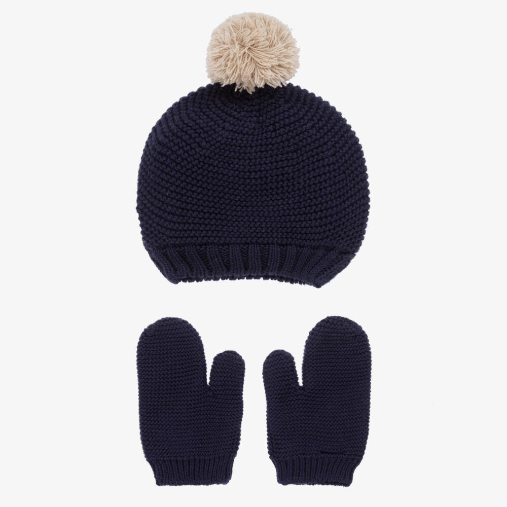 Sweet navy blue hat and mittens set for baby boys and girls, by Spanish brand Babidu. Knitted in soft cotton, the beanie has an adorable fluffy beige pom-pom on the top and a ribbed brim. Ideal for colder days, it comes with a pair of cute navy blue mittens to complete the set.