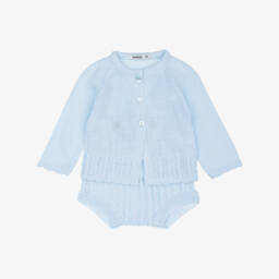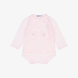 A pale pink shorts set for little girls by Babidu, made in a soft, lightweight knit, with a sweet cable pattern. The traditionally styled shorts have fixed, button-fastening shoulder straps that cross over on the back. They come with a matching cardigan, with pearlescent button fastenings and delicate scalloped trims.