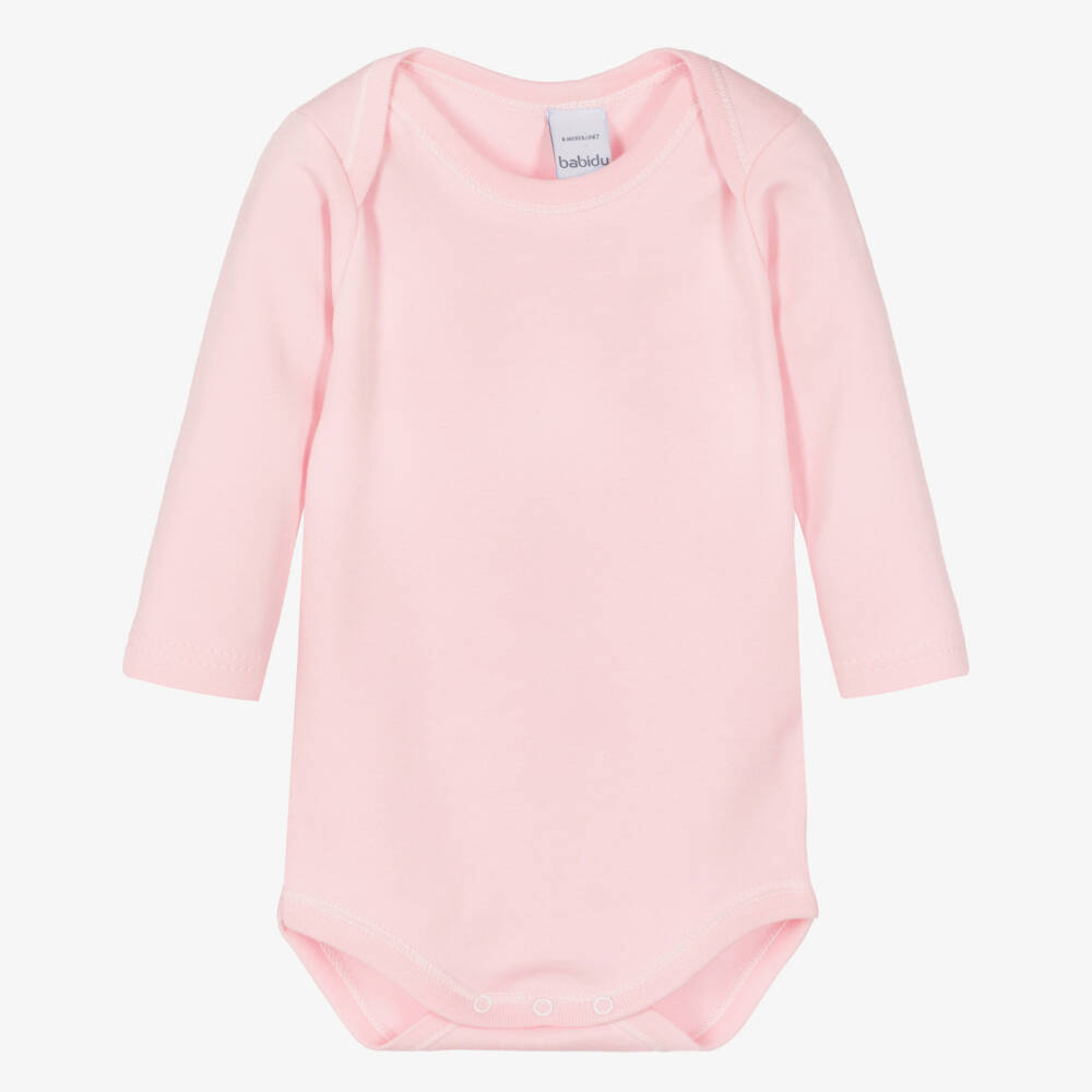 Pink cotton jersey bodyvest by Babidu, suitable for baby girls. This lovely long-sleeved design has an envelope neckline and poppers between the legs for easy dressing and changing.