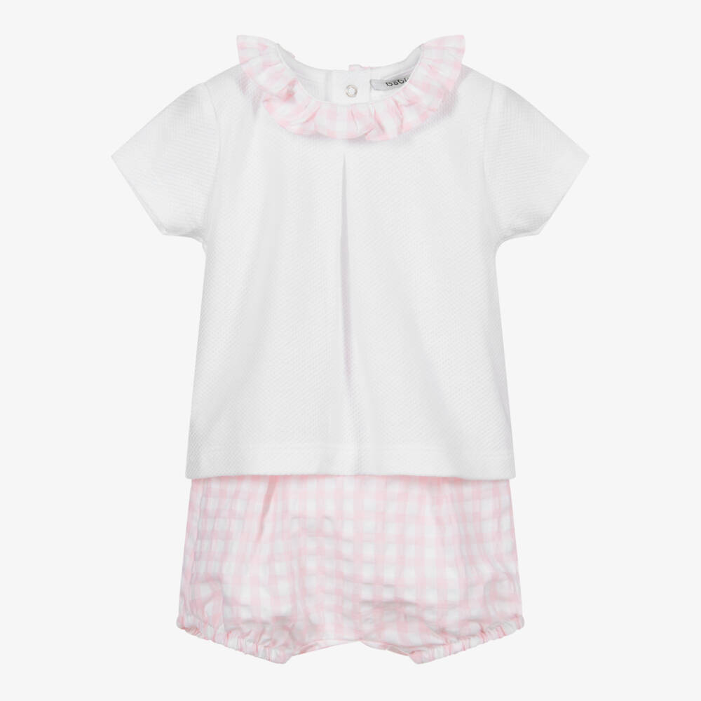 Baby girls pink and white cotton shorts set by Babidu. Soft and lightweight, the white piqué cotton top has a pink check ruffle collar and back popper fastening. The matching checked shorts have an elasticated waist and leg holes.