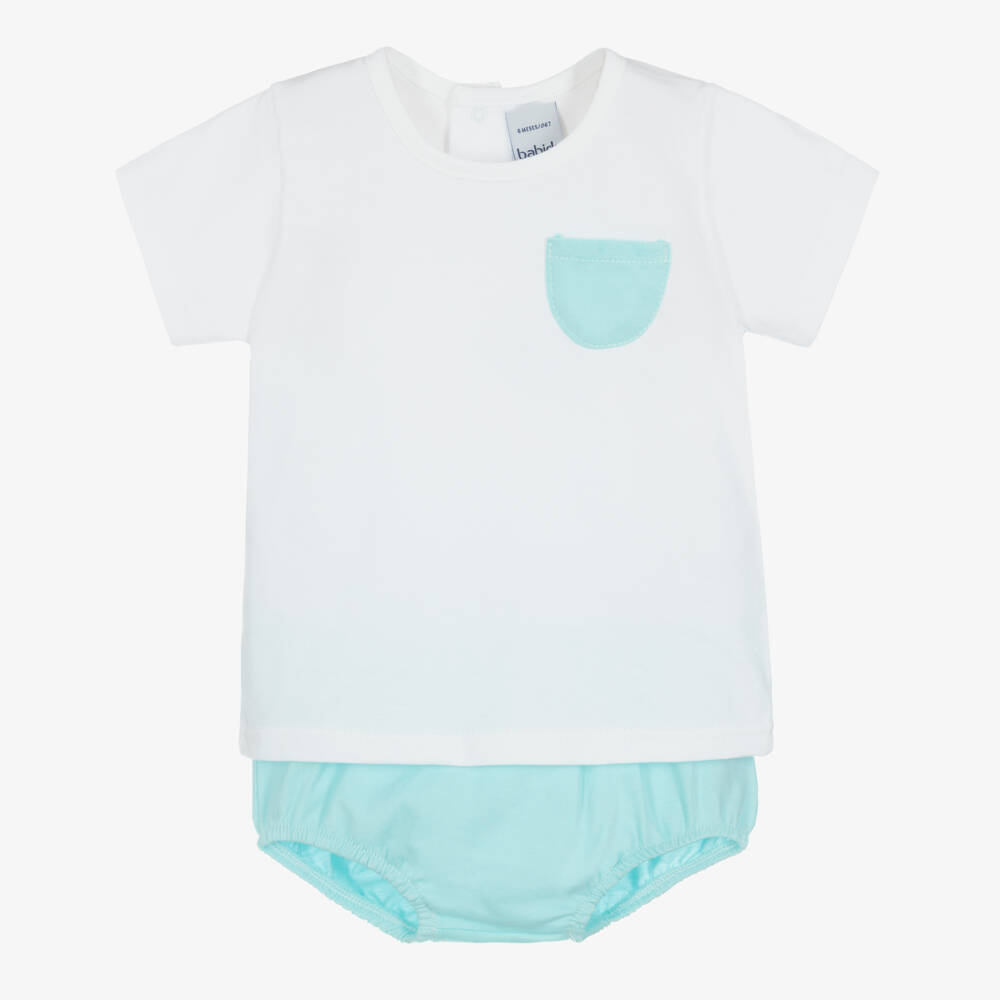 Comfortable white T-shirt and turquoise blue shorts set by Spanish brand Babidu, suitable for little boys and girls. Made in soft and stretchy cotton jersey, both pieces have cute little pocket details. Practical and easy to wear for everyday, the top has popper fastening on the back while the shorts are gently elasticated.