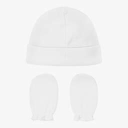 White layette hat and mittens set by Babidu for newborn baby boys and girls, made in soft cotton jersey to keep tiny heads warm, and protect baby's delicate skin from little scratches.