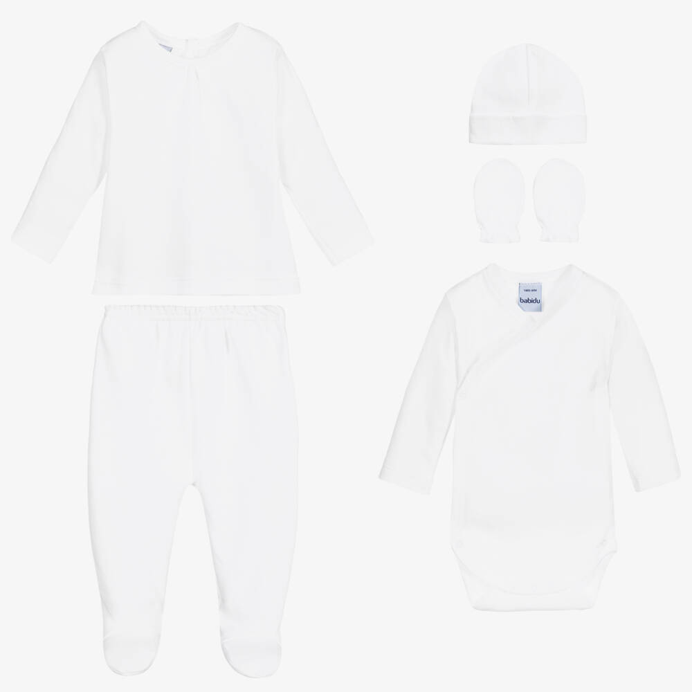 White babysuit set for little boys and girls by Babidu, made in soft cotton jersey. The two piece babygrow and bodyvest have useful popper fastenings to help with easy dressing. Elasticated mittens and a sweet layette hat complete this lovely set.
