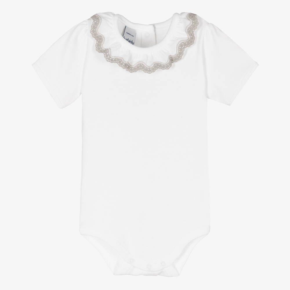 White short-sleeved bodysuit for baby boys and girls by Babidu, made in soft, stretchy cotton jersey. It has a cute ruffle collar with a grey lace trim. This versatile babysuit can be worn both as a bodyvest or a top, never becoming untucked.