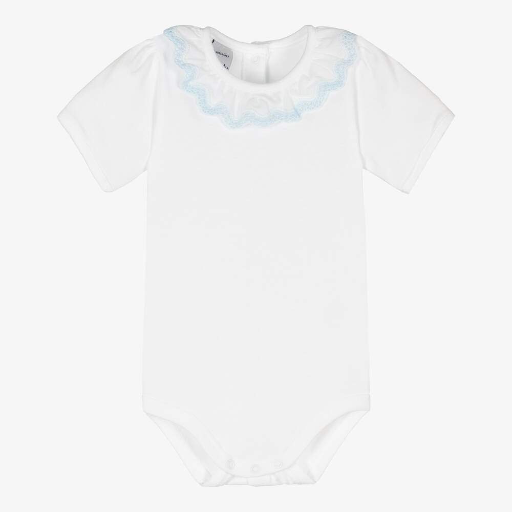 White short-sleeved bodysuit for baby boys and girls by Babidu, made in soft, stretchy cotton jersey. It has a cute ruffle collar with a blue lace trim. This versatile babysuit can be worn both as a bodyvest or a top, never becoming untucked.