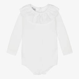 A white cotton babysuit for girls from Babidu. This timeless design is made in soft, stretchy and comfortable jersey with a smart ruffle collar. There are easy-to-fasten poppers on the back and between the legs for quick dressing and changing.