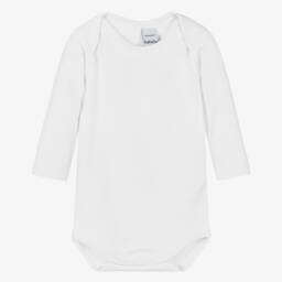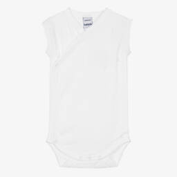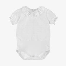A classic white cotton bodysuit for baby boys and girls by Babidu, made from lightweight and gentle muslin. This simple layering piece has a frilly collar with buttons fastening neatly on the back. It has a jersey bottom half that secures with poppers for effortless changing.