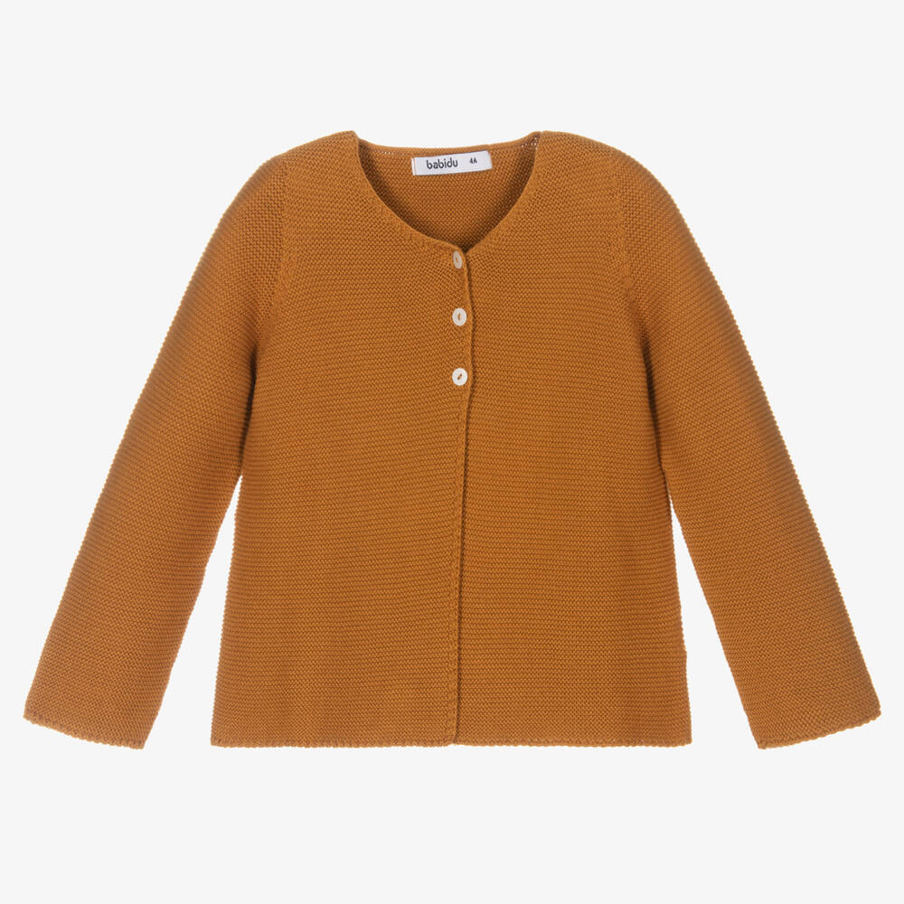 Ochre yellow knitted cardigan for boys and girls by Babidu, made in mid-weight cotton. The boxy cut creates a traditional look and it fastens with cute pearlescent buttons on the front.