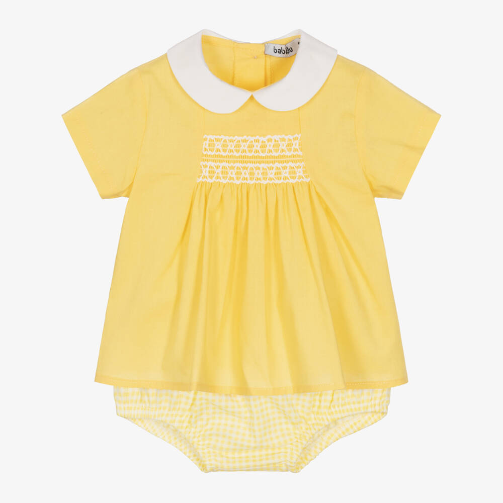 A charming yellow top and shorts set for little girls and boys by Babidu, made in soft and lightweight cotton. The top has a sweet Peter Pan collar, with traditional smocking detail on the front. The shorts are in a classic gingham check, and are gently elasticated around the waist and legs for a comfortable fit.