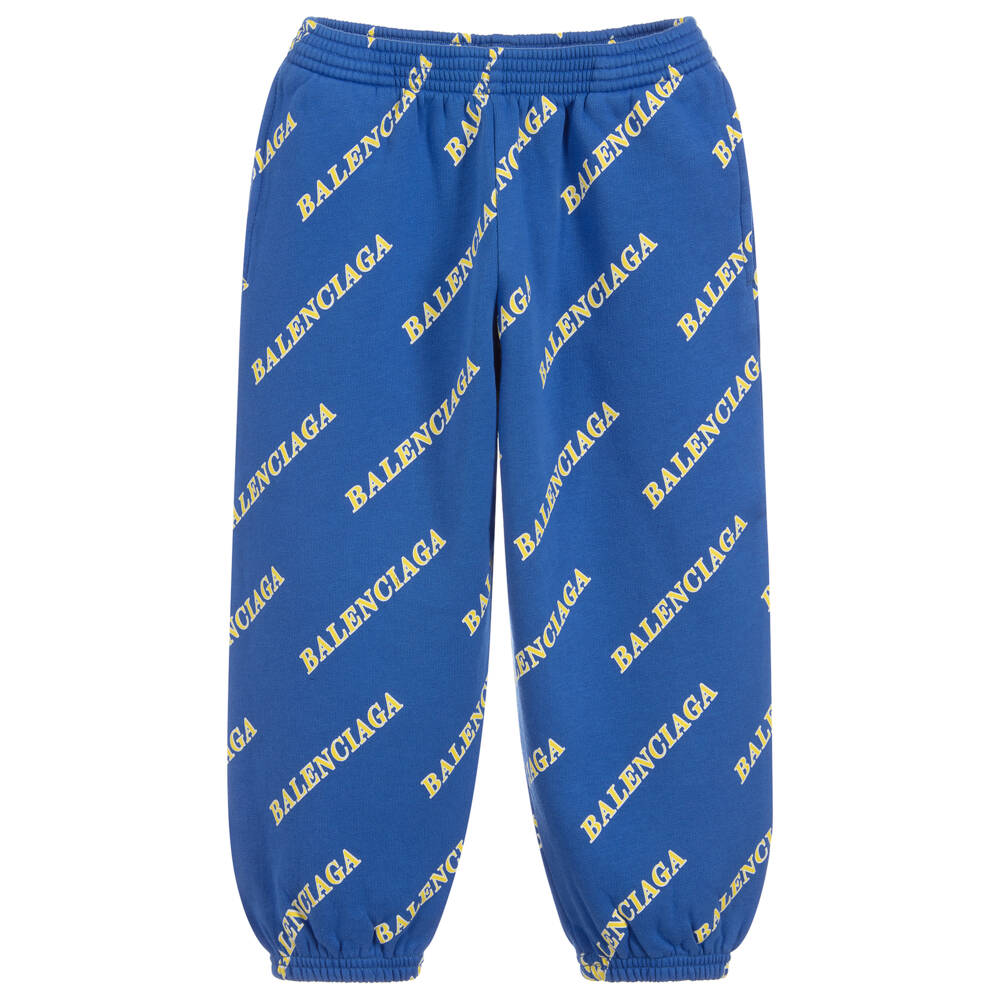 Bright blue joggers for boys and girls by luxury brand Balenciaga, with all-over yellow and white logo print. Made in mid-weight cotton sweatshirt jersey with a soft fleecy underside, they have side pockets, an elasticated waistband and cuffs.