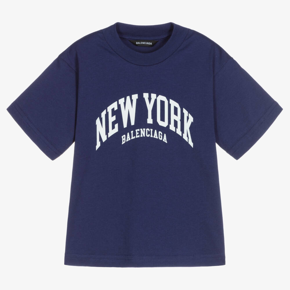 Deep indigo blue Mini-me cotton T-shirt for boys and girls by luxury brand Balenciaga. Made with soft and stretchy jersey, a Cities New York logo decorates the front in white, with the designer's logo beneath. There is a ribbed crew neckline for comfort.