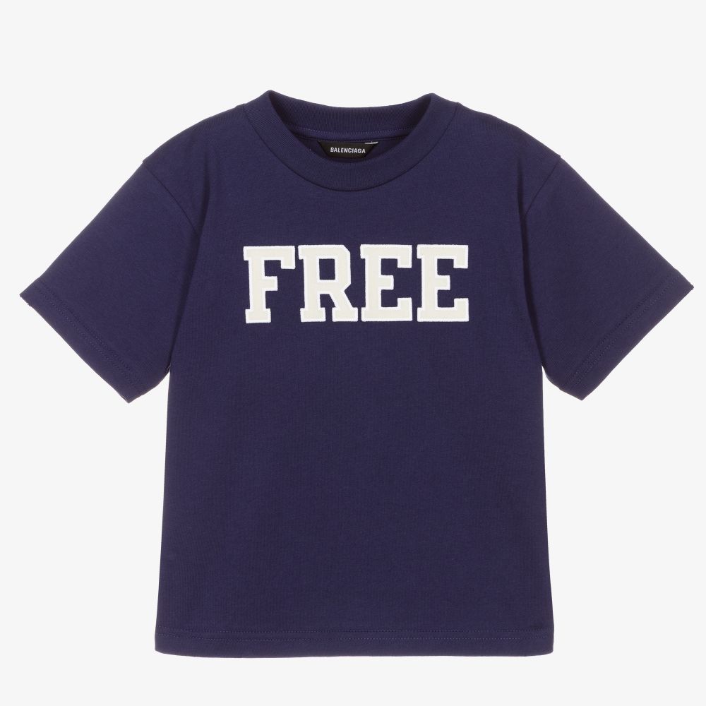Mini-me navy blue T-shirt for boys and girls by luxury Spanish designer Balenciaga. Made in soft and stretchy cotton jersey, it has a white FREE artwork appliqué on the front.