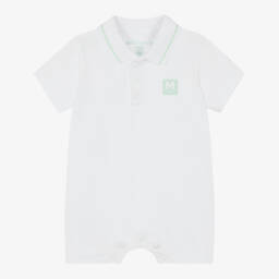 White cotton shortie for baby girls by Balloon Chic, with a beautiful cornfield poppy print. Made in lightweight poplin, it is full and bubble-shaped, with ruffles around the shoulders, bows on the front and gently elasticated cuffs. There are popper fastenings on the back and between the legs.