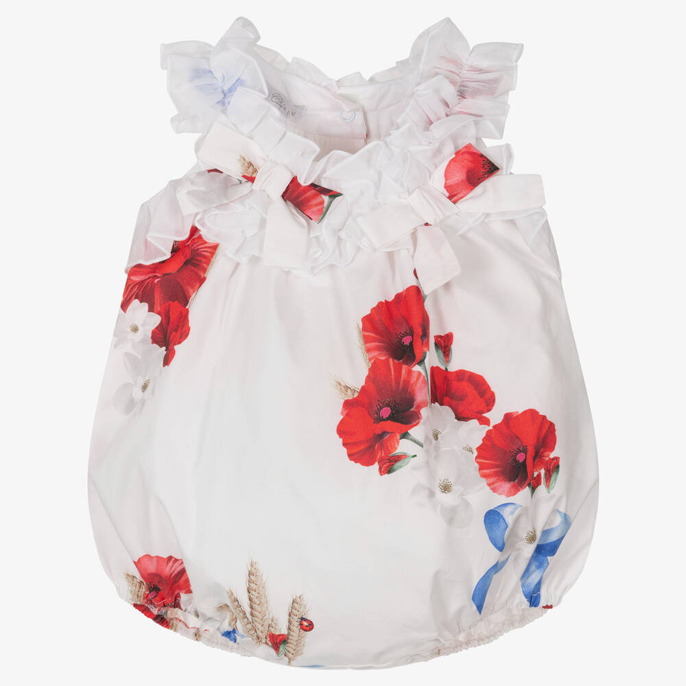 White cotton shortie for baby girls by Balloon Chic, with a beautiful cornfield poppy print. Made in lightweight poplin, it is full and bubble-shaped, with ruffles around the shoulders, bows on the front and gently elasticated cuffs. There are popper fastenings on the back and between the legs.
