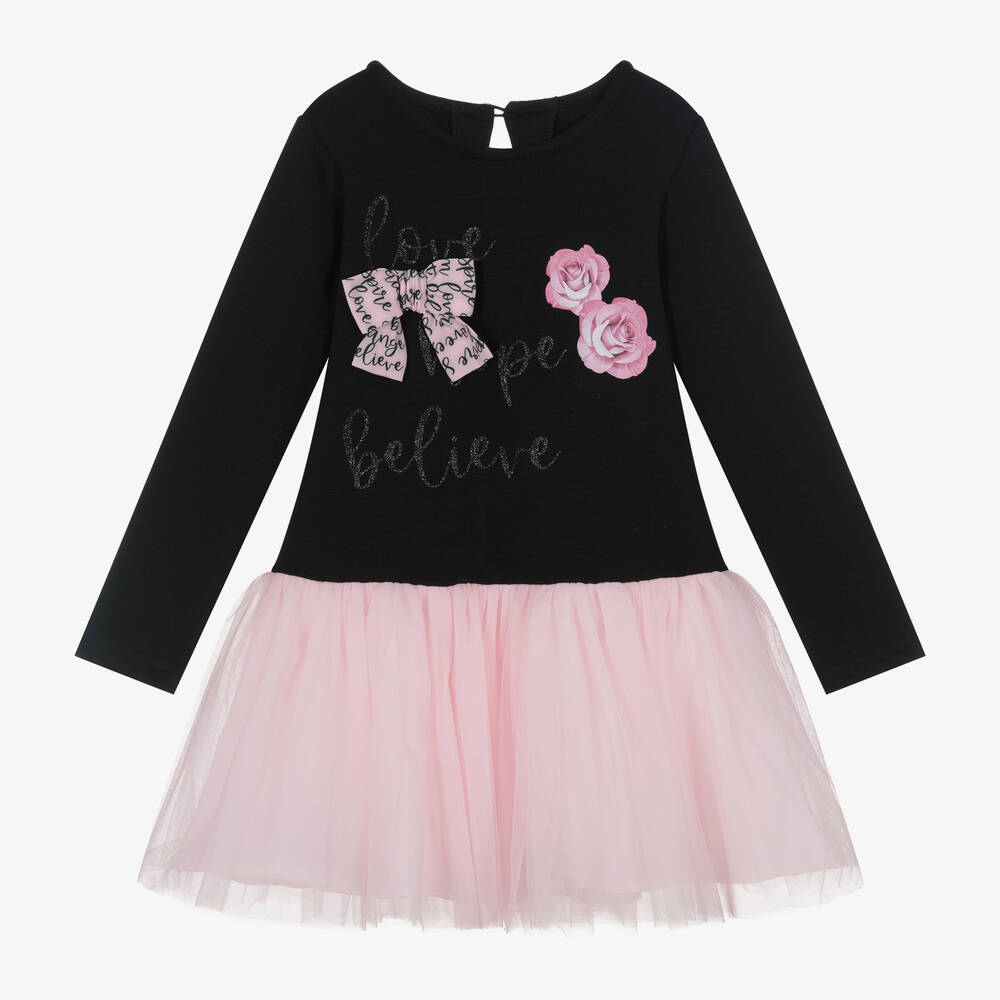Black and pink dress for girls by Balloon Chic, made from a soft cotton blend jersey, with a warm, fleecy inside. Both stylish and comfortable, this long-sleeved design is decorated on the front with a pink bow appliqué, elegant rose prints and shimmery positive slogans. It fastens with a single button on the back. The tutu-style skirt is made from layers of fine tulle for a pretty finish.
