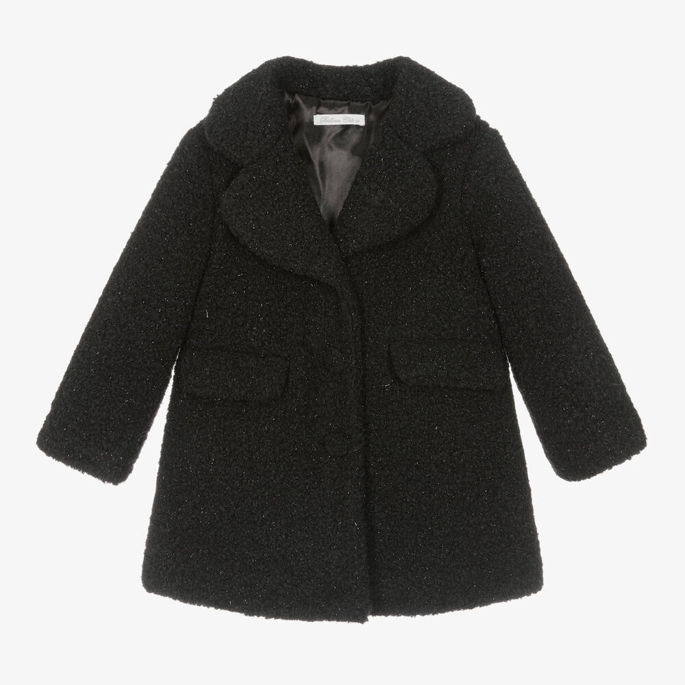 Smart and cosy, a black coat for girls by Balloon Chic, sparkling with shiny thread. Made in mid-weight bouclé, it has a wide lapel collar and front flap pockets. It fastens with bouclé-covered buttons and is lined in soft satin.