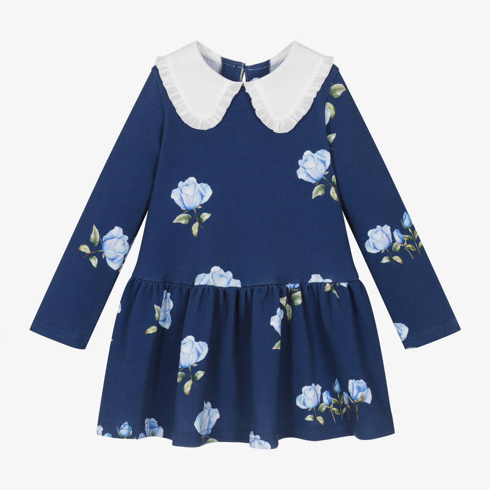 Pretty blue cotton dress for girls by Balloon Chic, with an eye-catching, contrasting blue rose bud print. Made in soft, comfortable, sweatshirt jersey, it has a smart, white poplin collar with a frilly trim, and a gathered, drop-waisted skirt. There is a keyhole button fastening on the back.