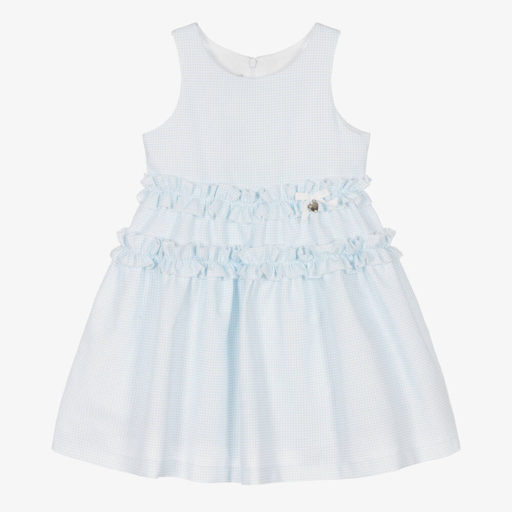 A beautiful blue and white cotton dress by Balloon Chic. It has a double ruffle trim around the waist, finished with a dainty bow and silver heart charm. It has a soft cotton lining with a stiff hem for a classic, voluminous and feminine silhouette. Easy to fasten, this dress has a concealed zip on the back for easy dressing.