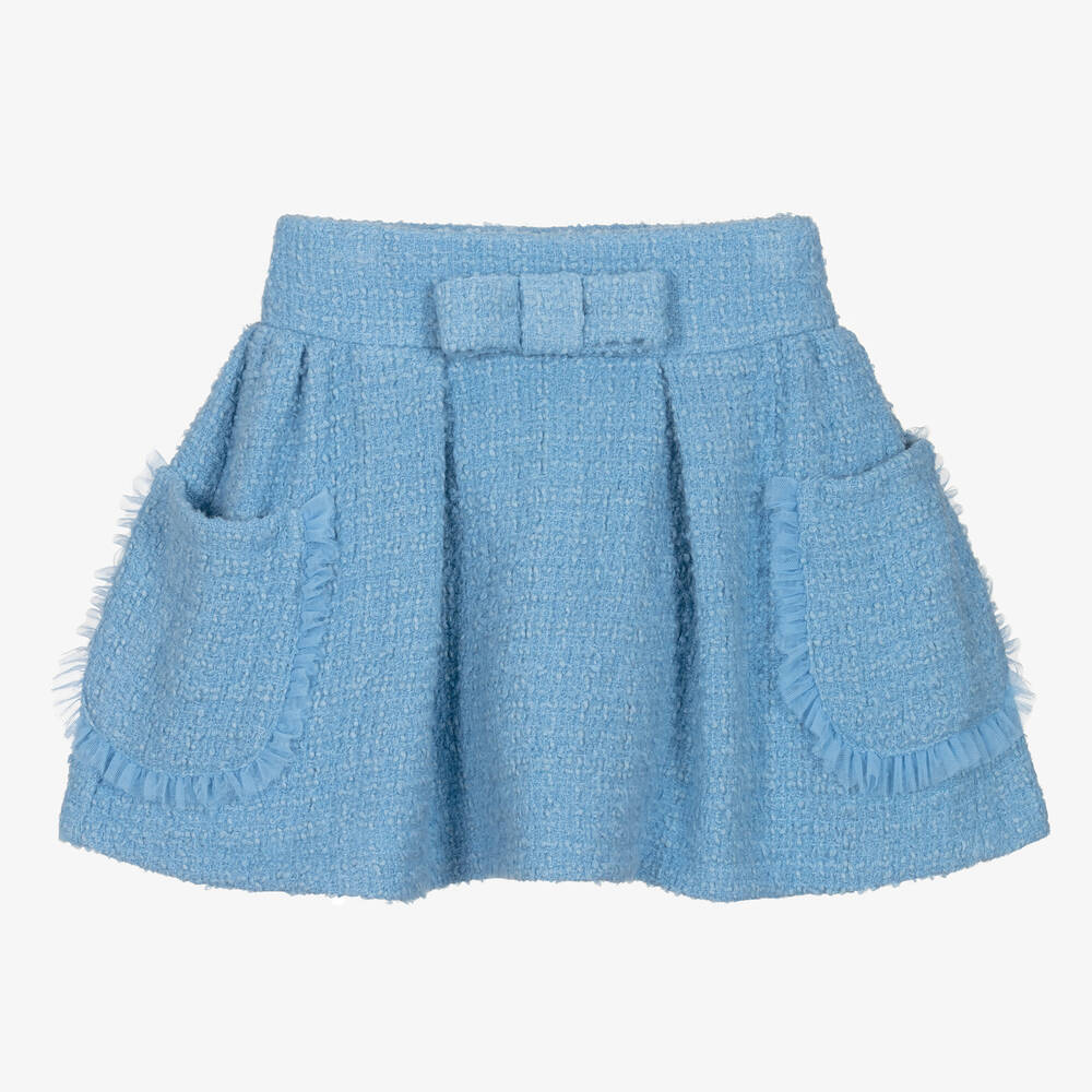 A stylish blue tweed skirt for girls by Balloon Chic, made from a soft wool blend. This pretty skirt has large patch pockets trimmed with tulle frills on the front and is fully lined in lightweight voile for added comfort. It has an adjustable waist and fastens with a concealed side zip for a discreet finish. There is a stylish bow on the front to complete the feminine look.