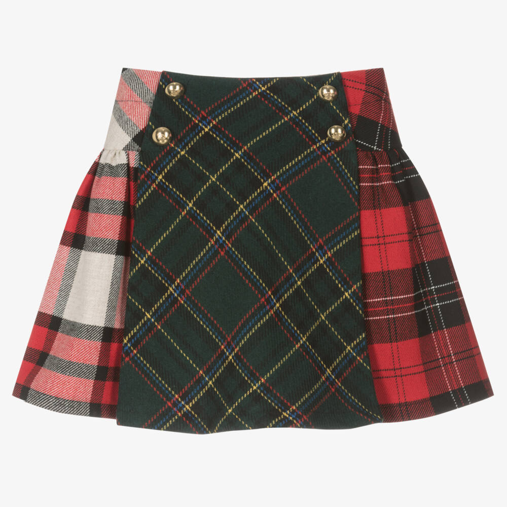 This softly woven skirt for girls is by Balloon Chic. Made in a luxurious wool blend, it is panelled with a mix of check and tartan patterns in green, red, ivory and black. The gold-tone decorative buttons are embossed with crown motifs for a smart look. It has a comfortable cotton lining, an adjustable waist for the ideal fit, and a hidden zip closure on the back.