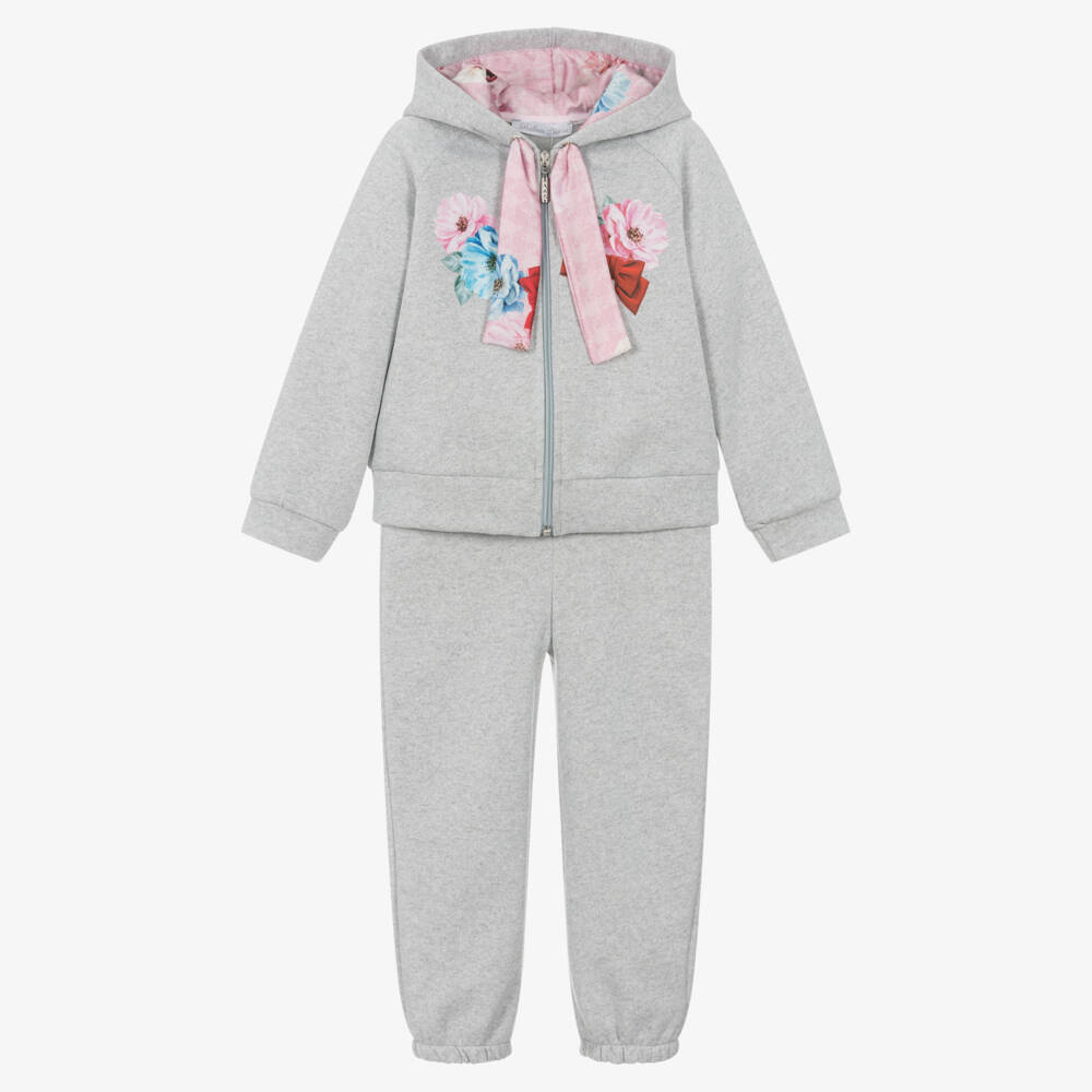 Lovely grey cotton tracksuit for girls from Balloon Chic. Both pieces are made in soft and stretchy sweatshirt jersey, with a fleecy inside for a comfortable and cosy feel. The zip-up hooded top has a lovely floral print on the front with a red bow and diamanté detailed 'B'. The hood is lined with floral printed soft chiffon, with faux drawstring ribbon ties. The matching joggers have a slightly gathered waistband and elasticated cuffs.