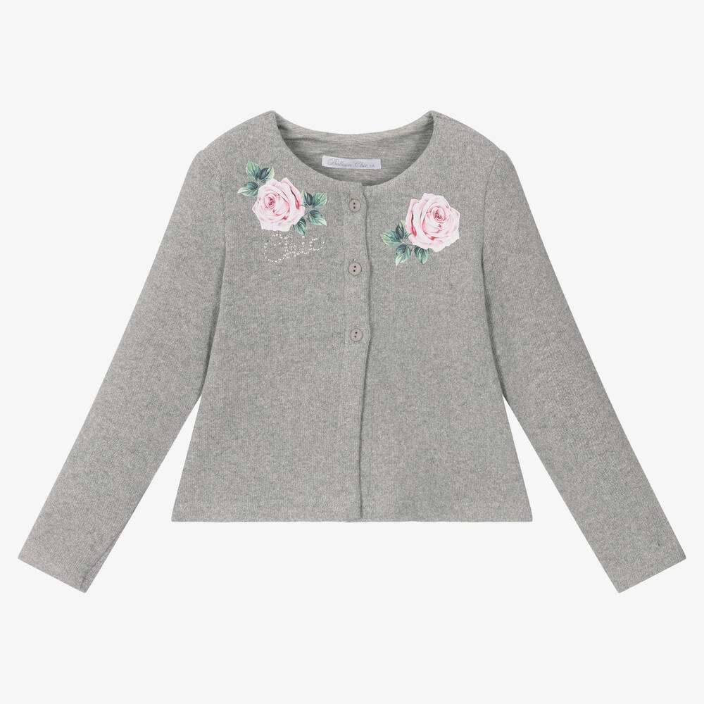 Girls grey cotton cardigan by Balloon Chic. Soft and stretchy, it has a warm knitted feel and fastens down the front with tonal grey buttons. The front is printed with a pretty pink rose design.