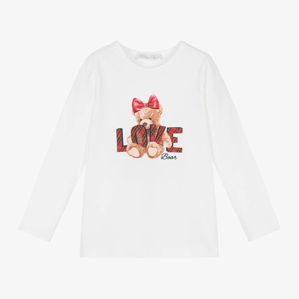An ivory top for girls from Balloon Chic, made in soft-stretch cotton jersey. Sweet and adorable, it has a beige teddy bear wearing a diamanté-studded bow and the word, 'Love' in red tartan.