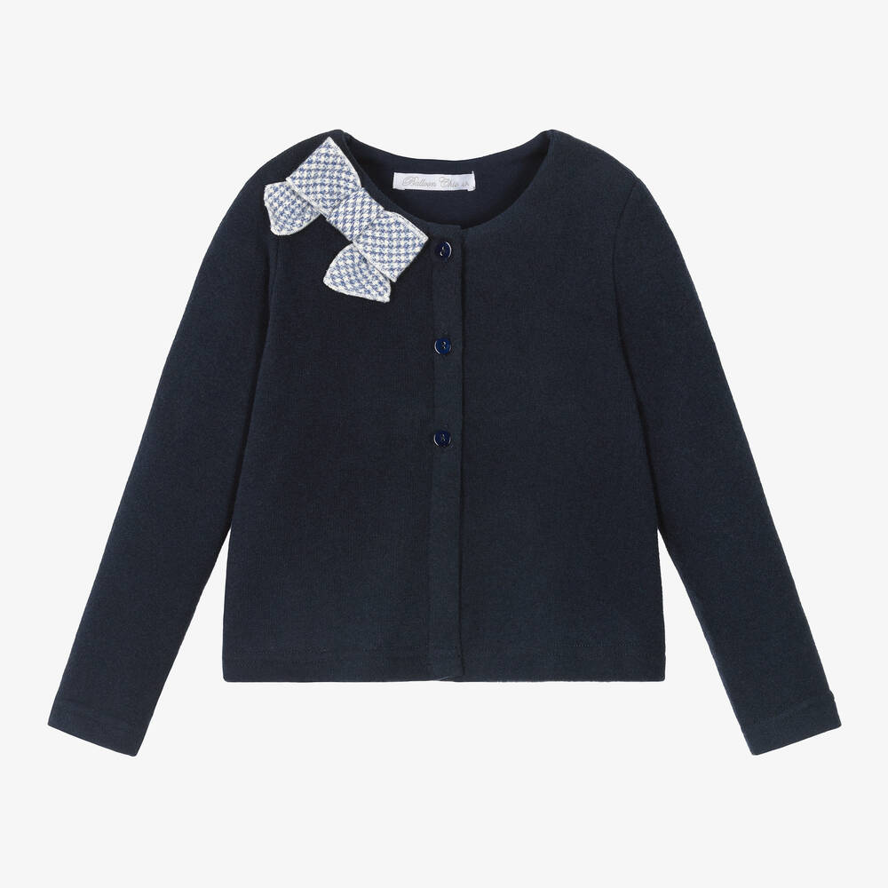A navy blue cardigan for girls from Balloon Chic. Beautifully soft and cosy, this classic style is knitted in a comfortable cotton mix with a partial jersey lining. It fastens with buttons and has a lovely blue and ivory houndstooth bow on one shoulder adding a pretty touch.