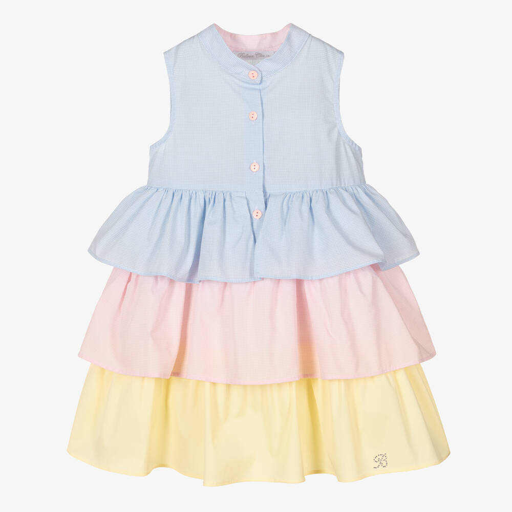 Sweet blue sleeveless dress for girls, by Balloon Chic. Woven in lightweight cotton, it has a lovely gingham print all-over with pastel blue, pink and yellow trims. This collarless style has pastel pink button fastenings on the front for practicality and style, and the voluminous tiered skirt flares out in a beautiful, full shape.