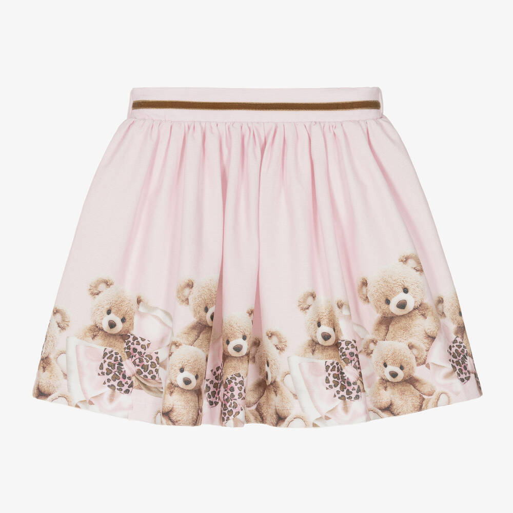 A pale pink skirt for girls by Balloon Chic, with a gorgeous teddy bear print around the hemline. With a pretty flared silhouette, it is woven in soft needlecord and lined in lightweight cotton voile. The waistband is trimmed in beige velvet on the front and is elasticated at the back for a comfortable fit.