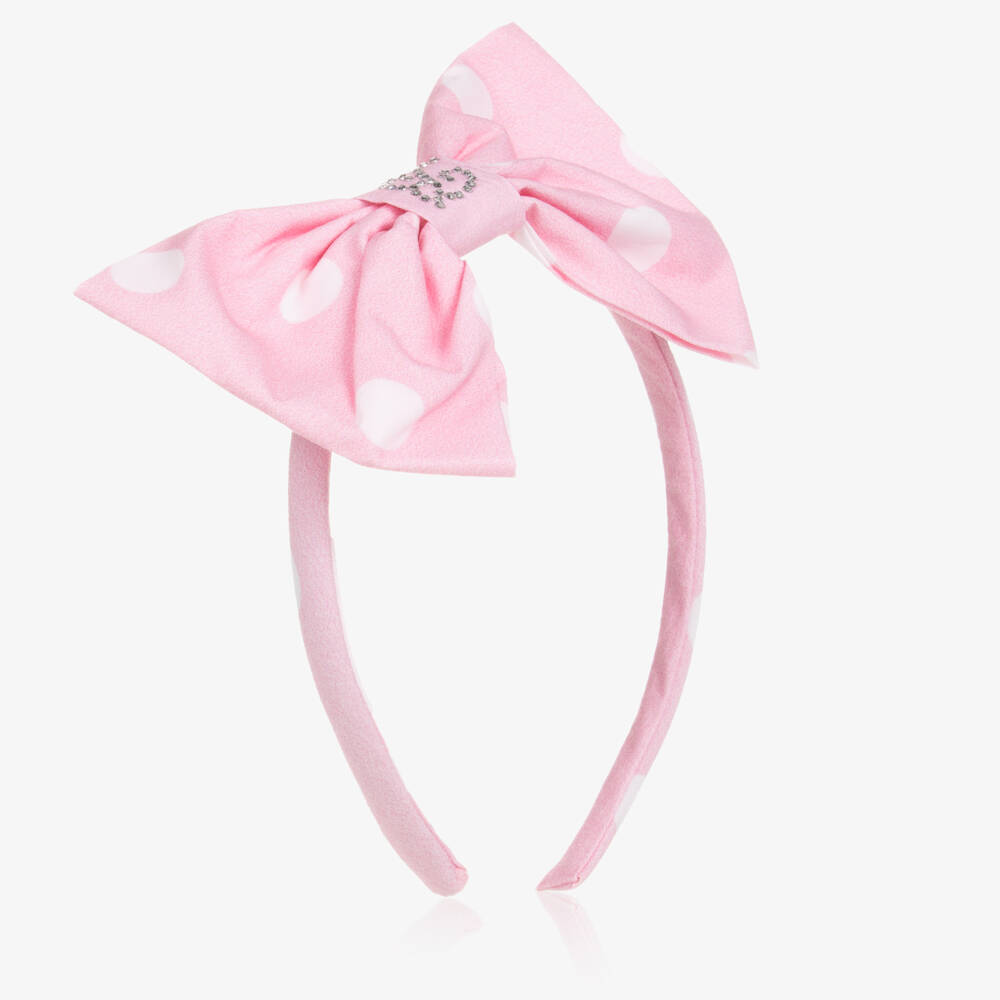 Pretty pink and white polka dot hairband for girls by Balloon Chic. The slim, flexible band is covered in cotton poplin and has a matching fabric bow with a diamanté logo in the centre.