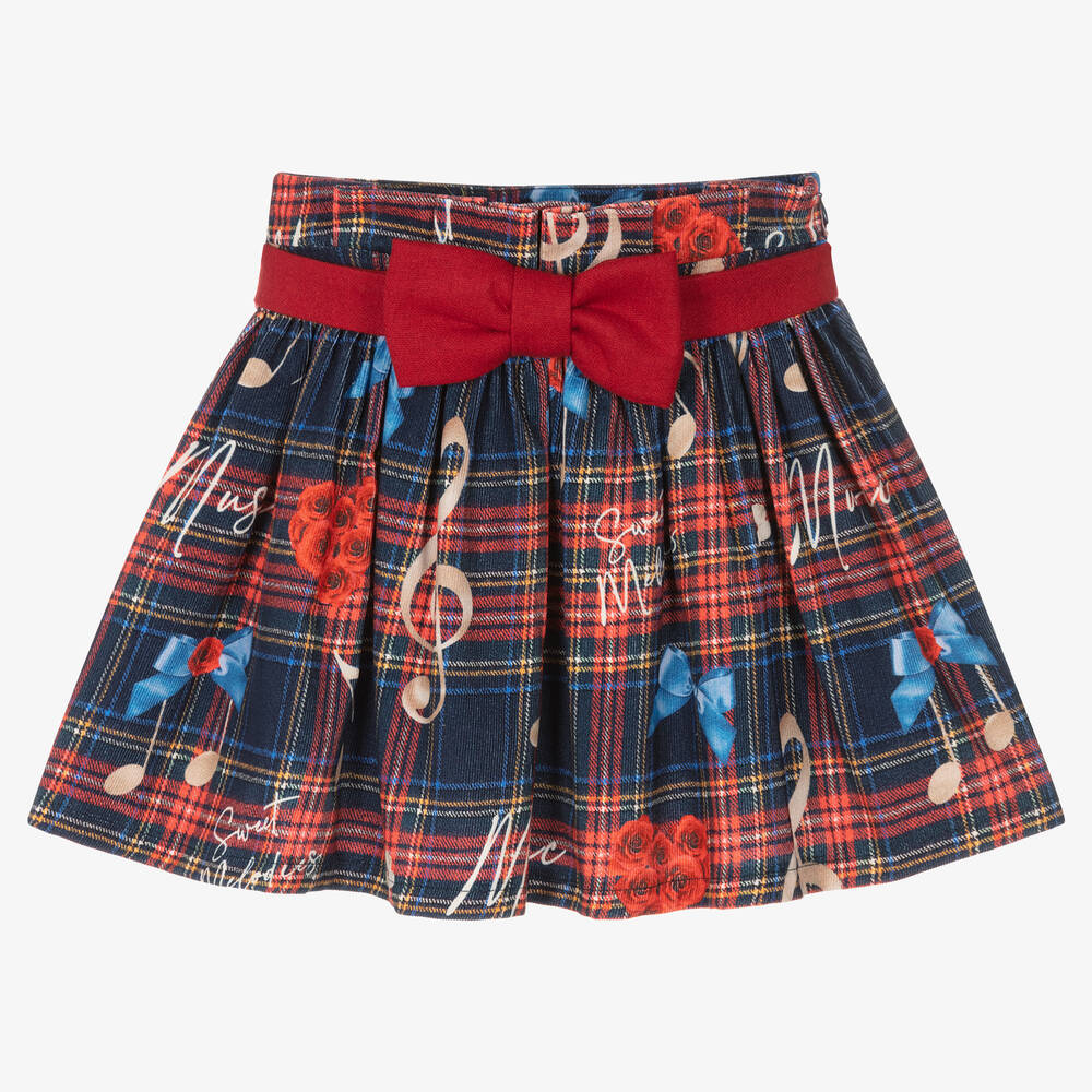 Girls smart red tartan and musical note print skirt by Balloon Chic. Woven in a warm, mid-weight cotton corduroy fabric, the design has a fit and flared shape, with a red flannel half-belt and bow appliqué on the front. The skirt fastens at the side with a concealed zip and is fully lined in soft cotton for comfort.