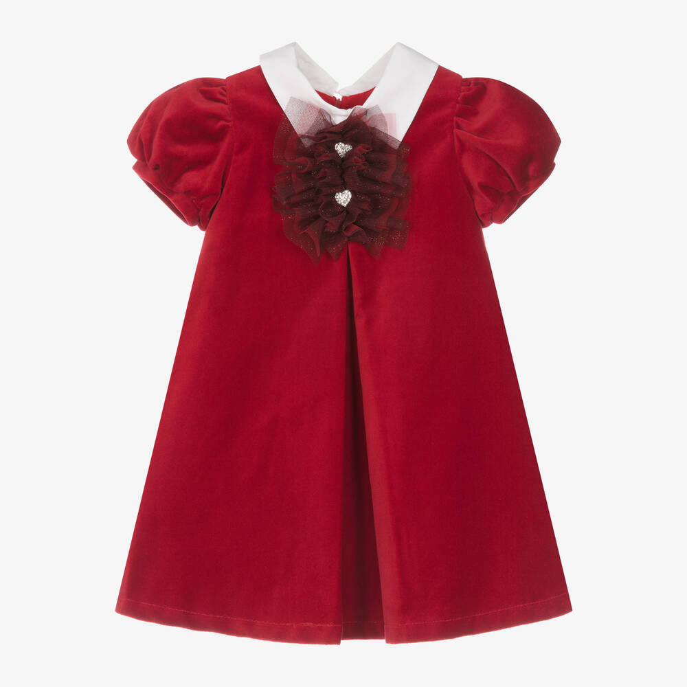 A beautiful red dress for girls by Balloon Chic, made in soft cotton velvet. This chic design has a white poplin collar, puffed sleeves, and a sparkling tulle appliqué on the bodice, complete with heart-shaped, diamanté faux buttons. It is lined with cotton for comfort, styled with inverted pleats for an A-line silhouette, and fastens with a zip and hidden button on the back.