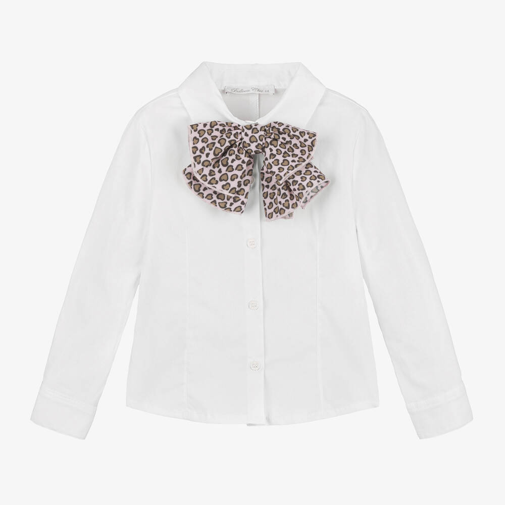 White cotton poplin shirt for girls by Balloon Chic, with a slightly fitted shape and hint of stretch. Fastening with pearlescent buttons, this classic design has a smart pointed collar. It comes with an adjustable, silky bow tie, patterned with a pretty heart-shaped leopard print in pale pink, brown and black.