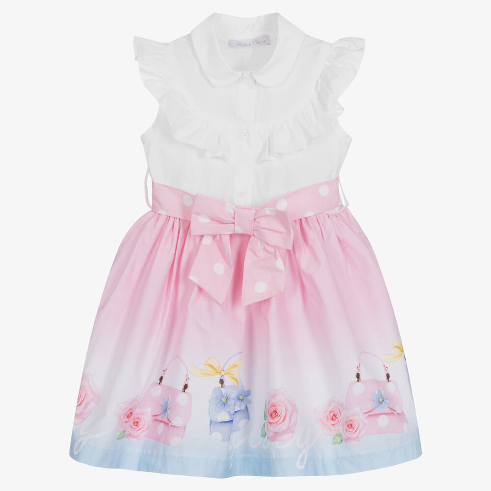Sweet white and pink dress for girls by Balloon Chic, woven in soft cotton poplin. The sleeveless bodice has ruffles across the front and on the sleeve for a pretty look and a rounded collar for a traditional twist. Fastening with buttons on the front, the smart bodice flow into a full, pleated skirt which is patterned with cute flowers and handbags. Lined in soft cotton for comfort, this lovely dress is accessorized by a pink velcro sash belt with an oversized bow around the waist.