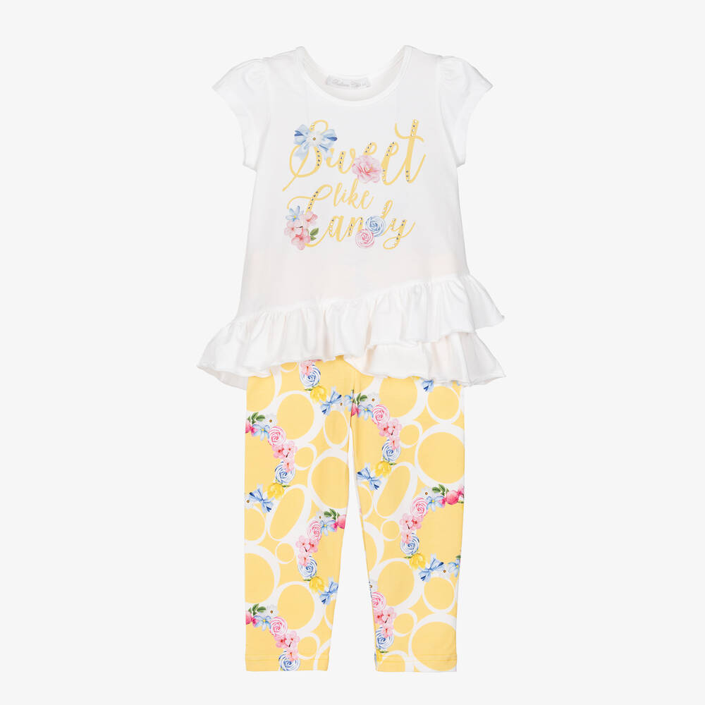 A white and yellow leggings set for girls by Balloon Chic, made in soft cotton jersey. Sparkling with diamantés, the white top has a 'Sweet Like Candy' motif on the front and a stylish asymmetric ruffle hem. With a pretty candy and floral print, the yellow leggings have an elasticated waistband for a comfortable fit.